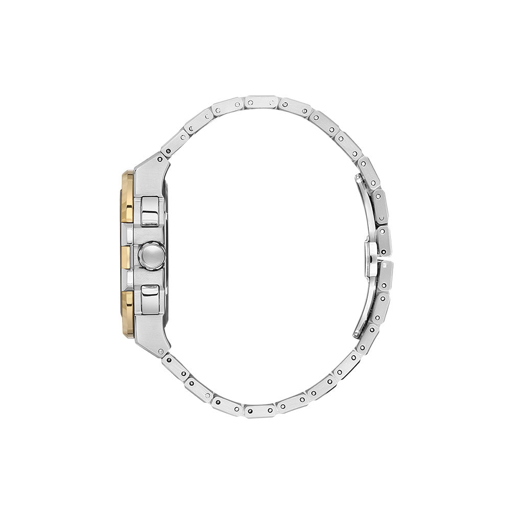 الهيكل الفضي المائل للذهبي مع السوار المصنوع من الفولاذ المقاوم للصدأ بيمنح الساعة قوة تحمّل وثبات ممتاز، مع مظهر راقٍ يناسب الاستخدام اليومي والمناسبات الرسمية في نفس الوقت. التصميم متوازن بعناية، علشان تلبسها مع بدلة رسمية أو إطلالة كاجوال أنيقة بنفس الثقة.