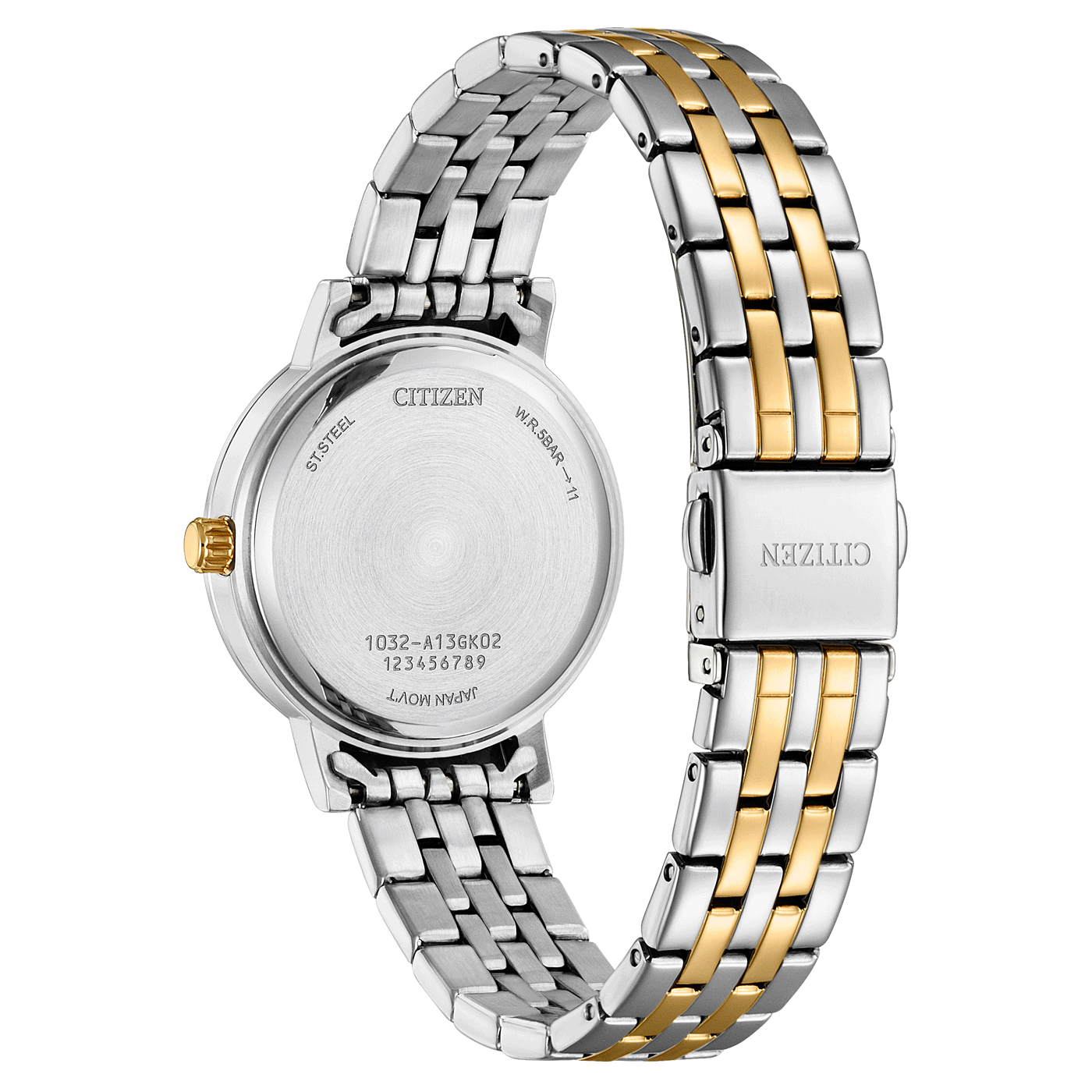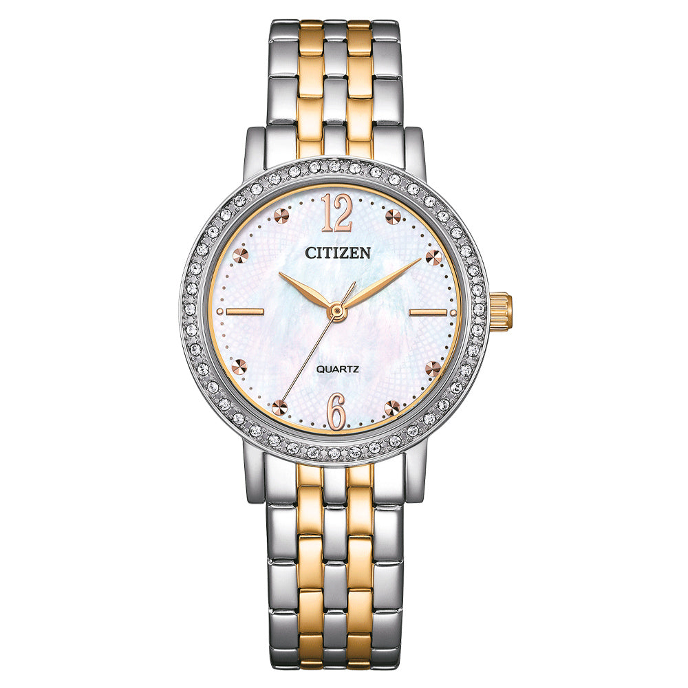 ساعة سيتيزن كوارتز للنساء بسوار من الستانلس ستيل بلون ذهبي وفضي وميناء صدفي EL3106-59D