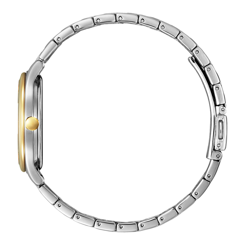 تُقدِّم سيتيزن هذه الساعة النسائية بتصميم راقٍ يجسد الأناقة الكلاسيكية بلمسة عصرية. تأتي بميناء صدفي متلألئ يعكس الضوء بشكل جميل، محاط بإطار مرصع بالكريستالات اللامعة التي تضفي بريقًا أنثويًا فخمًا.