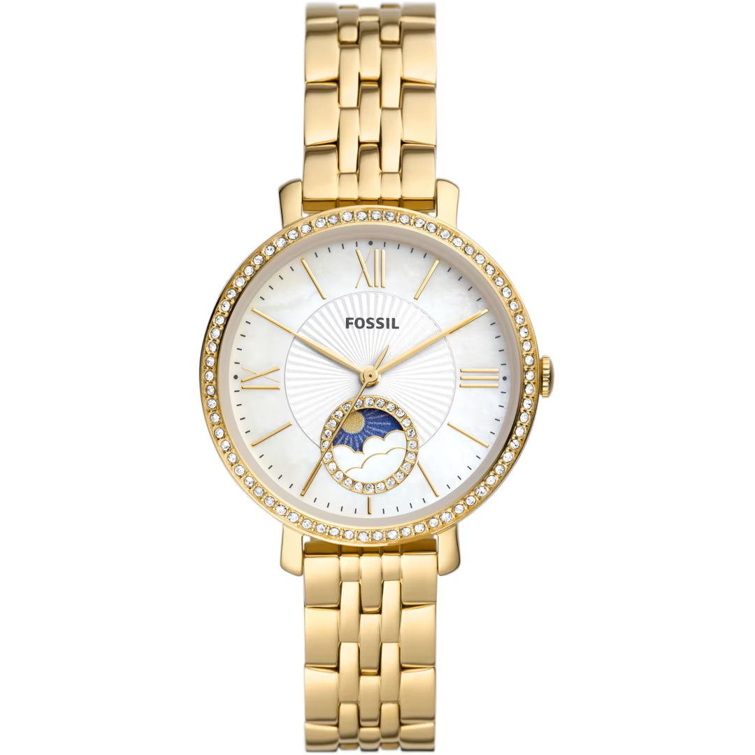 تميّزي بإطلالة راقية مع ساعة فوسيل كوارتز للنساء بتصميم ذهبي فخم يعكس أنوثة مترفة وتفاصيل دقيقة. تأتي هذه الساعة بسوار من ستانلس ستيل الذهبي اللامع يمنحك لمسة فاخرة، بينما يضفي الميناء الأبيض المزدان بعرض مرحلة القمر سحرًا خاصًا وأناقة لا تُقاوم.