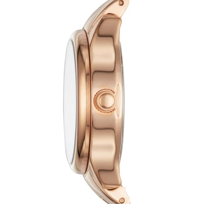 تألقي بإطلالة أنثوية راقية مع ساعة فوسيل للنساء بتصميم يجمع بين الفخامة والعصرية. تأتي الساعة بسوار من الستانلس ستيل المطلي باللون الذهبي الوردي يمنحها مظهرًا أنيقًا يدوم طويلاً، وميناء مرصع بالكريستال اللامع يعكس أنوثة متألقة في كل تفصيلة.