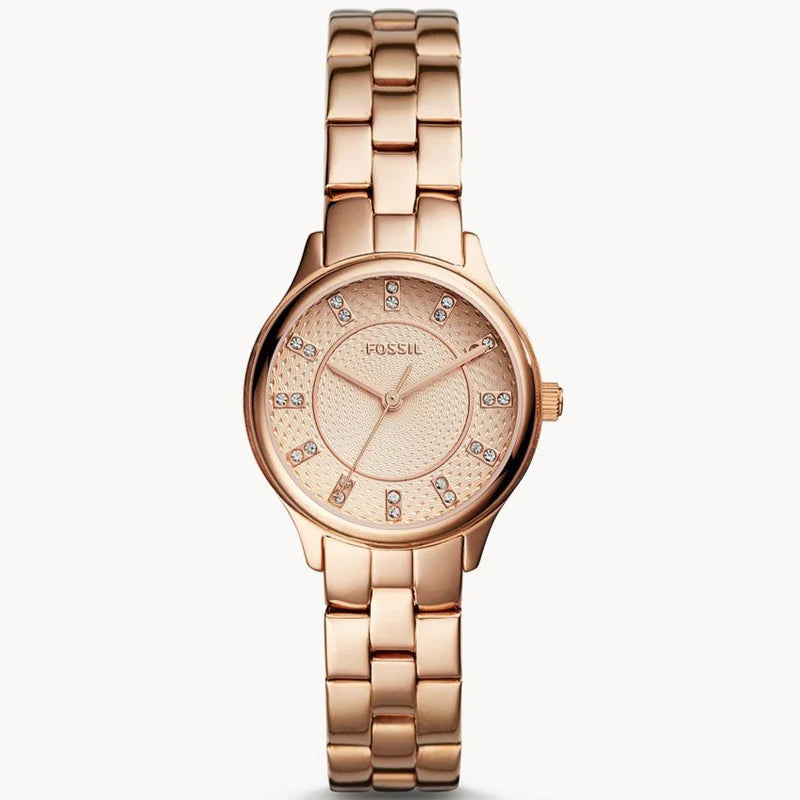 ساعة فوسيل للنساء بسوار من الستانلس ستيل المطلي باللون الذهبي الوردي وميناء مرصع بالكريستال BQ1571