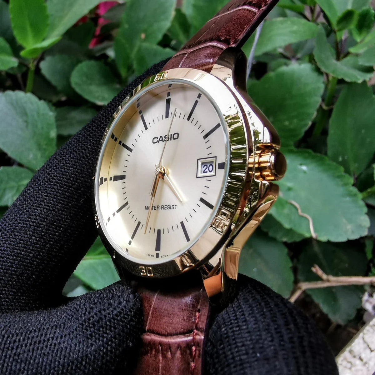 ساعة كاسيو MTP-V004GL-9AUDF تتميز بتصميم كلاسيكي راقٍ يجمع بين البساطة والأناقة، حيث تأتي بقرص دائري باللون الذهبي الفاتح مع مؤشرات واضحة لعرض الوقت بسهولة، إضافة إلى نافذة صغيرة تعرض التاريخ بشكل عملي. هيكل الساعة مطلي باللون الذهبي اللامع، مزوّد بحزام جلدي بني فاخر يمنح مظهرًا أنيقًا يناسب الإطلالات الرسمية والكاجوال على حد سواء. تعمل الساعة بآلية كوارتز دقيقة، كما تتمتع بزجاج معدني مقاوم للخدش يحافظ على مظهرها الأنيق مع الاستخدام اليومي. هذه الساعة هي خيار مثالي للرجل الذي يبحث عن لمسة كلاسيكية أنيقة تبرز شخصيته في كل مناسبة.