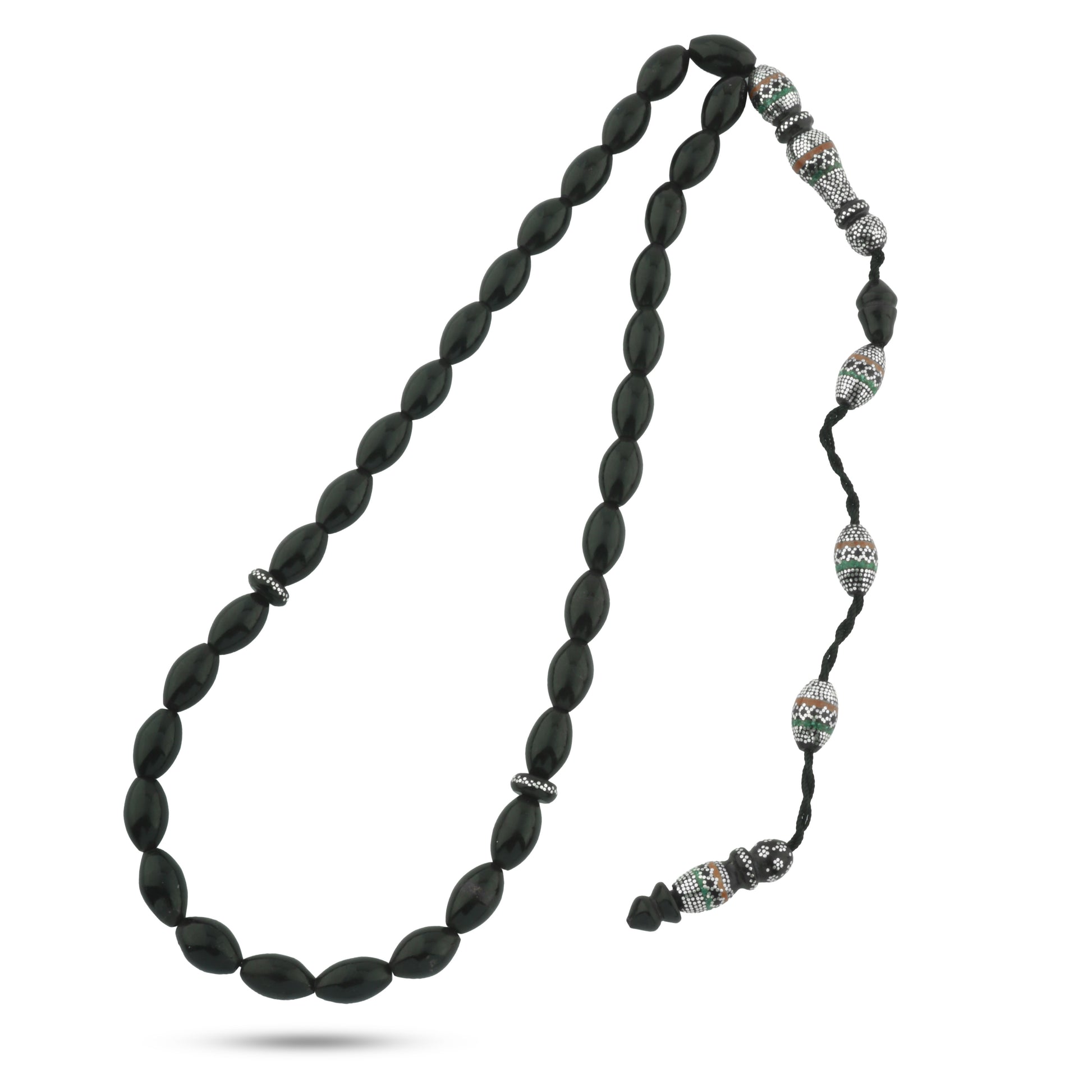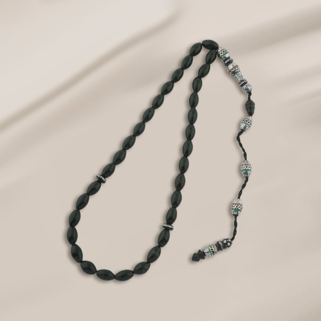 السبحة مطعّمة بطقم فضة عيار 999 خالصة عالية النقاء، مع دمج فني متوازن لأحجار الكهرمان والملاكيت، التي تضيف تباينًا لونيًا جذابًا وعمقًا بصريًا يميّز القطعة عن غيرها. هذا المزج بين اليسر الطبيعي والأحجار الكريمة يمنح السبحة طابعًا فاخرًا يجمع بين الروحانية والذوق الرفيع.