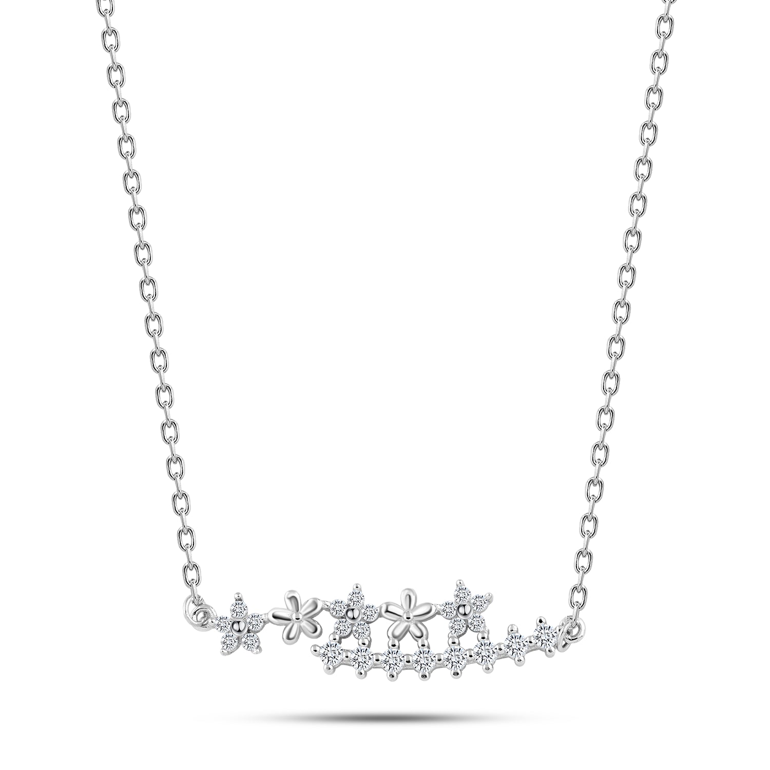 أبرزي أنوثتك ورقتك مع عقد "أناقة الزهور" فضة عيار 925 المصمم بتفاصيل دقيقة مستوحاة من جمال الطبيعة. يتميز العقد بسلسلة رفيعة مرصعة بزهور صغيرة متألقة، يزين كل منها فصوص براقة تضيف لمسة من السحر والجاذبية. مصنوع من فضة استرليني 925 عالية الجودة لضمان المتانة واللمعان الدائم، مما يجعله قطعة مثالية للإطلالات اليومية والمناسبات الخاصة. إنه عقد يجمع بين الرقة والفخامة ليكون اختيارك الأمثل لإبراز شخصيتك الأنيقة والمرحة.