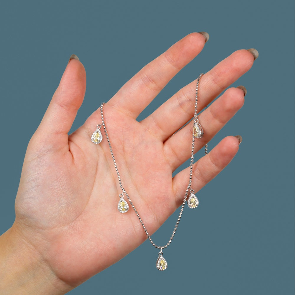 عقد فضي بتعليقات قطرة مرصعة بالزركون من فتحي إبراهيم هو تجسيد للأناقة الراقية والبساطة الفاخرة. يتميز هذا العقد اللوزة المرصع بالزركون الأصفر بتصميم ناعم من فضة لامعة عيار 925، تتدلّى منه خمس تعليقات على شكل قطرة براقة، كل واحدة منها مرصعة بحجر زركون متلألئ يعكس الضوء بإشراق مميز يمنحك حضورًا متوهجًا في كل مناسبة.