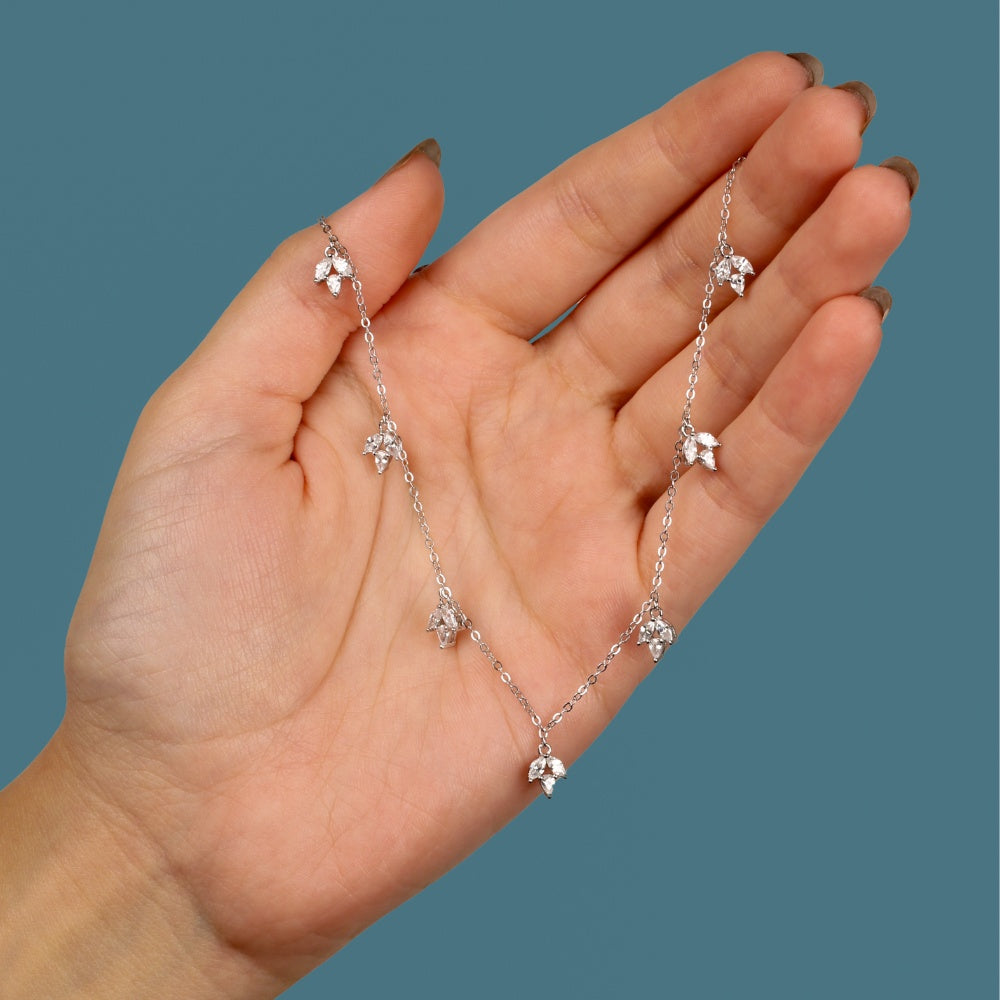 عقد فضة بتعليقات زهرية لامعة من فتحي إبراهيم هو قطعة مجوهرات تعبّر عن الرقي والأنوثة في أبهى صورها. يتميز هذا العقد الفضي بتصميم زهور براقة مرصعة بفصوص زركون صغيرة تعكس الضوء بجمال طبيعي يخطف الأنظار. تتوزع التعليقات الزهرية على طول السلسلة بطريقة متناغمة تمنح القطعة توازنًا بين البساطة والفخامة.