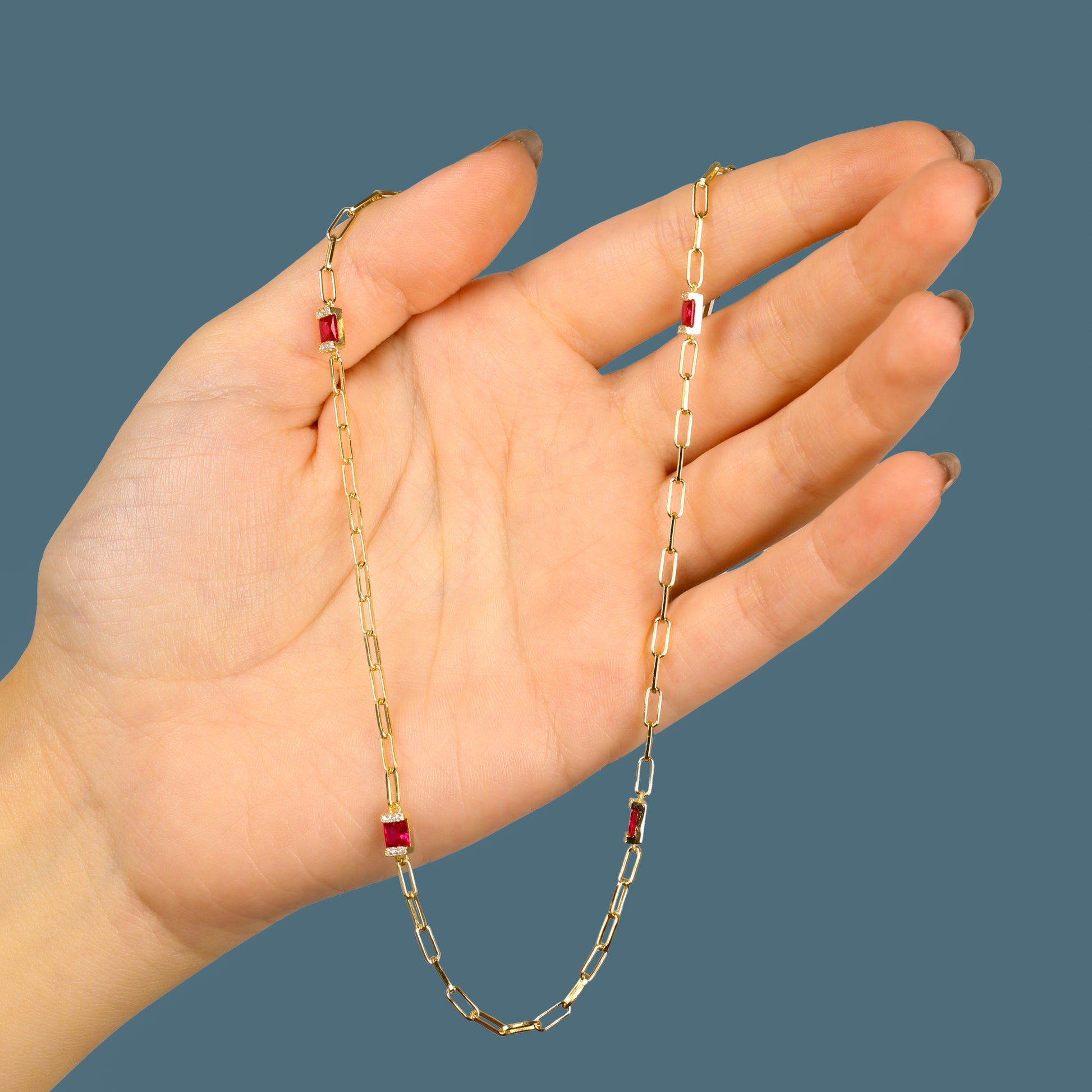 تتزين السلسلة بثلاثة فصوص حمراء لامعة بتقطيع مستطيل يعكس الضوء بطريقة آسرة، ليمنحك بريقًا نابضًا بالحيوية والأنوثة. اللون الأحمر الزاهي يتناغم بسلاسة مع لمعة الذهب ليكوّنا مزيجًا مثاليًا من الجمال والإشراق، يجعل من العقد قطعة لافتة تكمّل أي إطلالة أنيقة سواء في النهار أو المساء.