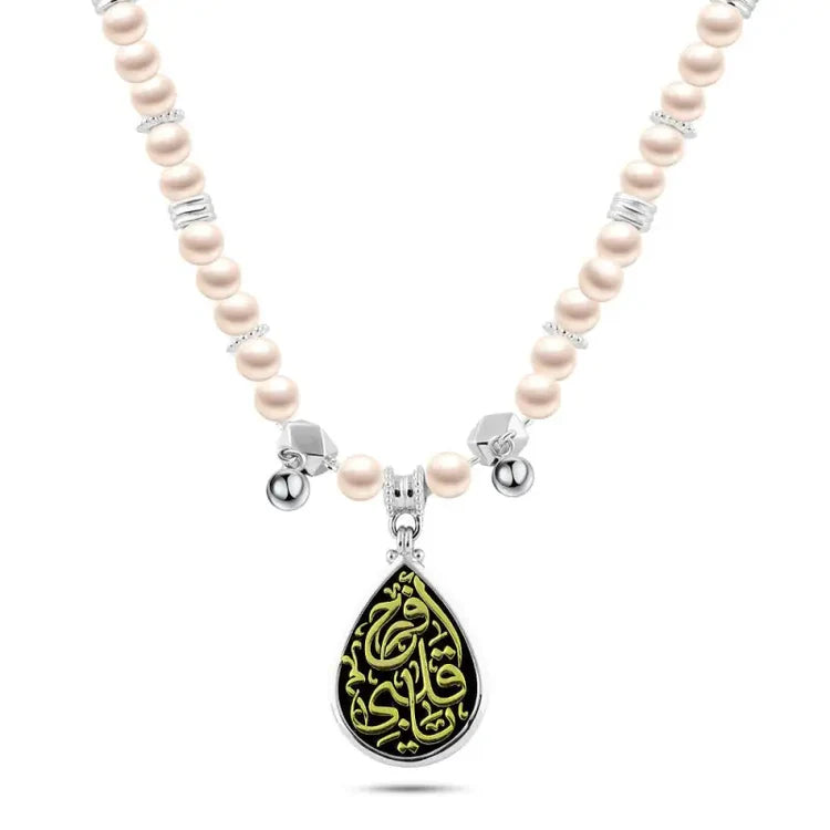 عقد فاخر مصنوع من حبات اللؤلؤ الناعمة مع تفاصيل معدنية لامعة تمنحه مظهرًا أنيقًا ومتوازنًا. تتدلى من منتصف العقد دلاية بشكل دمعة مزخرفة بخط عربي بارز مطلي باللون الذهبي فوق خلفية سوداء مطلية بأوكسيد، مما يضفي على القطعة لمسة فنية تراثية ذات طابع راقٍ وجذاب. يجمع هذا التصميم بين الأصالة والفخامة ليكون مناسبًا للمناسبات الخاصة أو كقطعة مميزة تضيف لمسة شخصية أنيقة لإطلالتك.