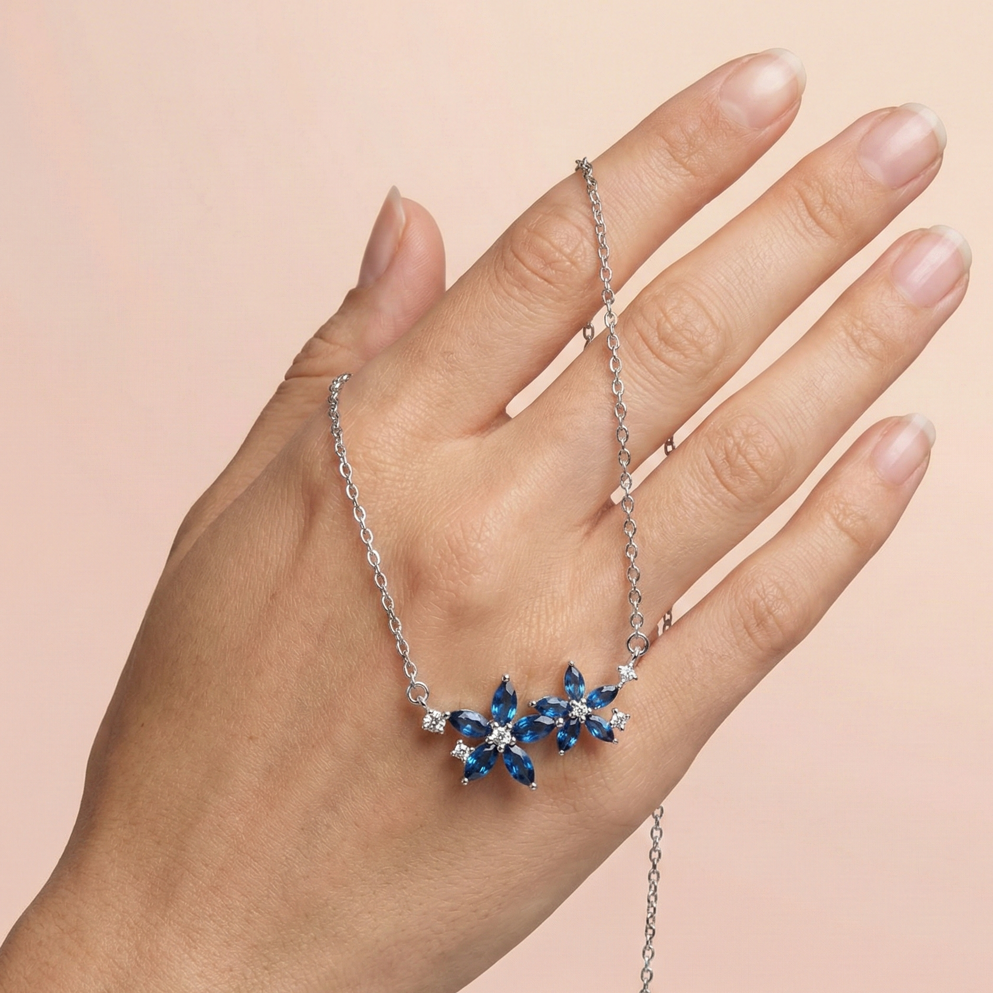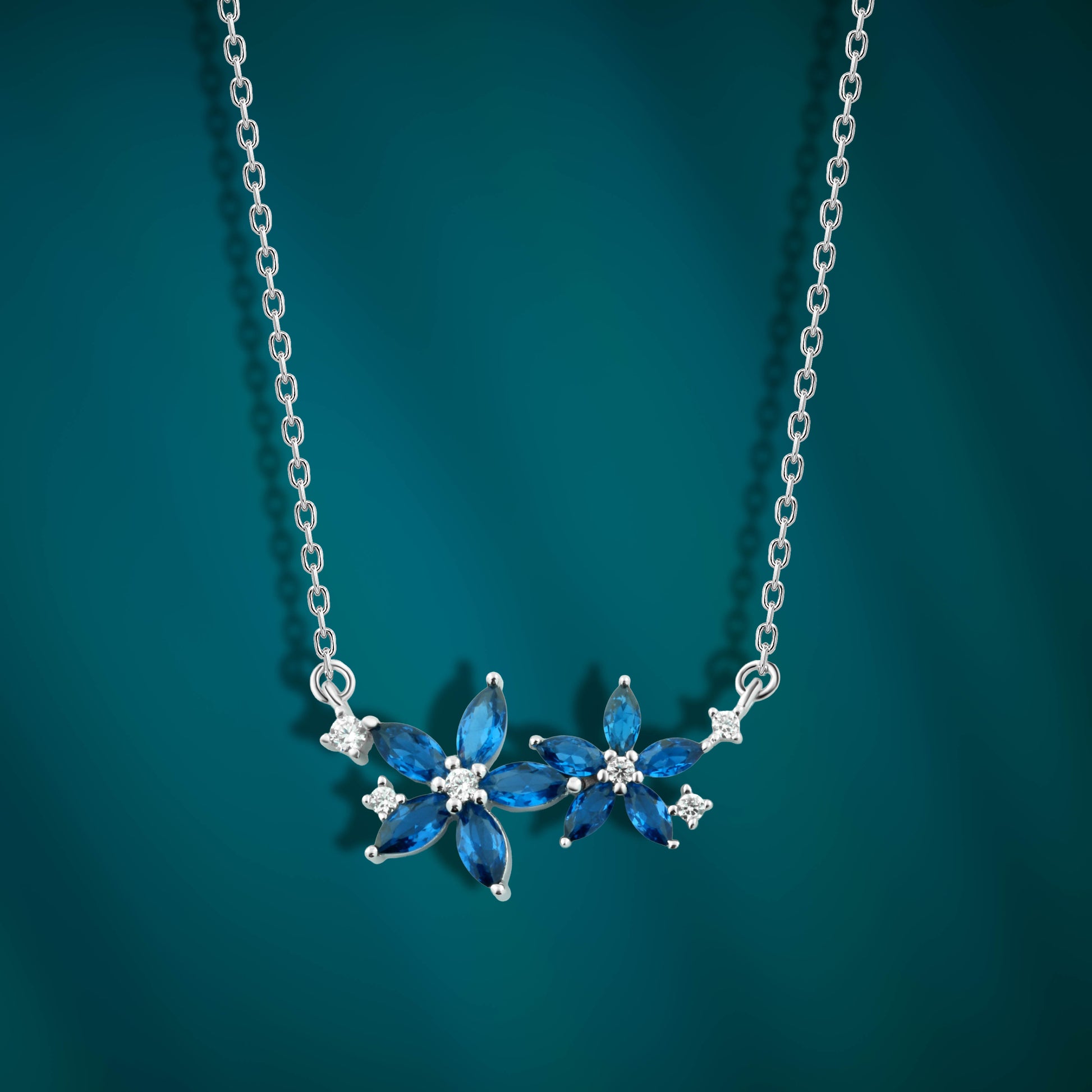 يتميّز التصميم بتفاصيل زهور صغيرة مرصّعة بفصوص زرقاء لامعة تضيف لمسة من الانتعاش والرقي، بينما يعكس اللون الأزرق الهدوء والصفاء في إطلالة جذابة تناسب جميع الأوقات. كل تفصيلة في هذا العقد مصمّمة بعناية لتُبرز جمالك الطبيعي وتمنحك حضورًا راقيًا لا يُنسى.
