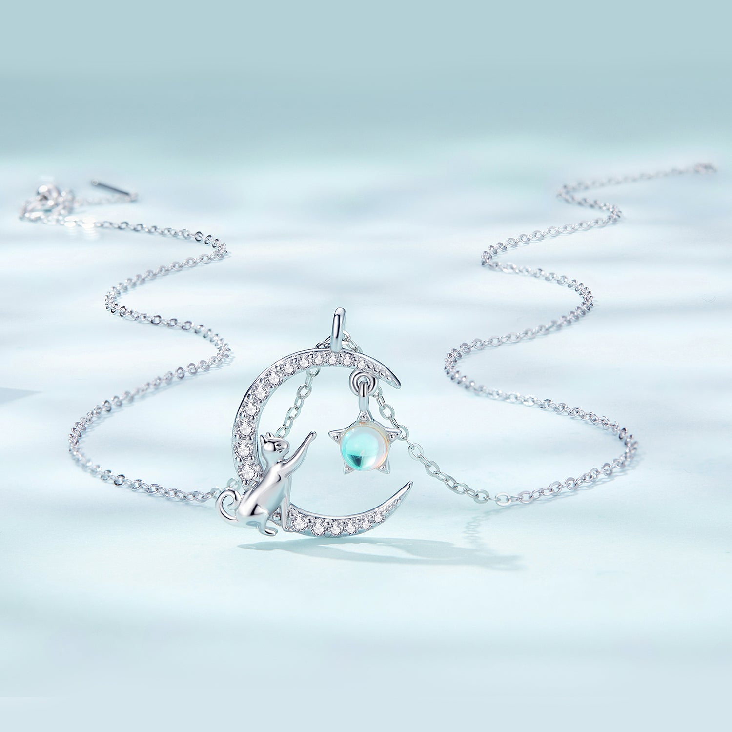 عقد فضة عيار 925 بتصميم قطة و قمر
