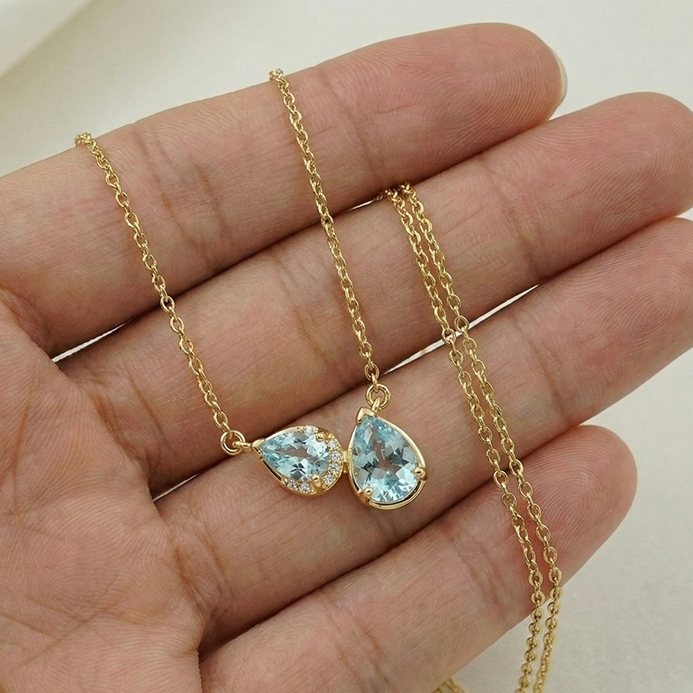 يتميّز التصميم بفصّين أزرق سماوي لامعين على شكل دمعة مزدوجة، يعكسان الضوء بانسجام رائع ليمنحاك إطلالة ناعمة ومشرقة تعبّر عن الصفاء والهدوء والرقي. تنسجم الفصوص الزرقاء مع السلسلة الفضية بتوازن مثالي، مما يجعل هذا العقد خيارًا أنثويًا جذّابًا يناسب الاستخدام اليومي والمناسبات الخاصة على حد سواء.