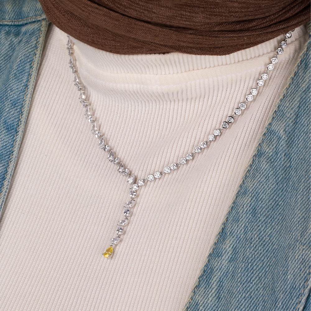 في منتصف العقد تتدلّى تعليقة صغيرة على شكل قطرة بلون أصفر مشرق تضيف لمسة دافئة من الحيوية والرقي، لتجعل القطعة تنبض بالتفرّد والأناقة. اللون الأصفر المتوهّج يمتزج بانعكاسات الفضة اللامعة ليقدّم توازنًا مثاليًا بين البساطة والفخامة.