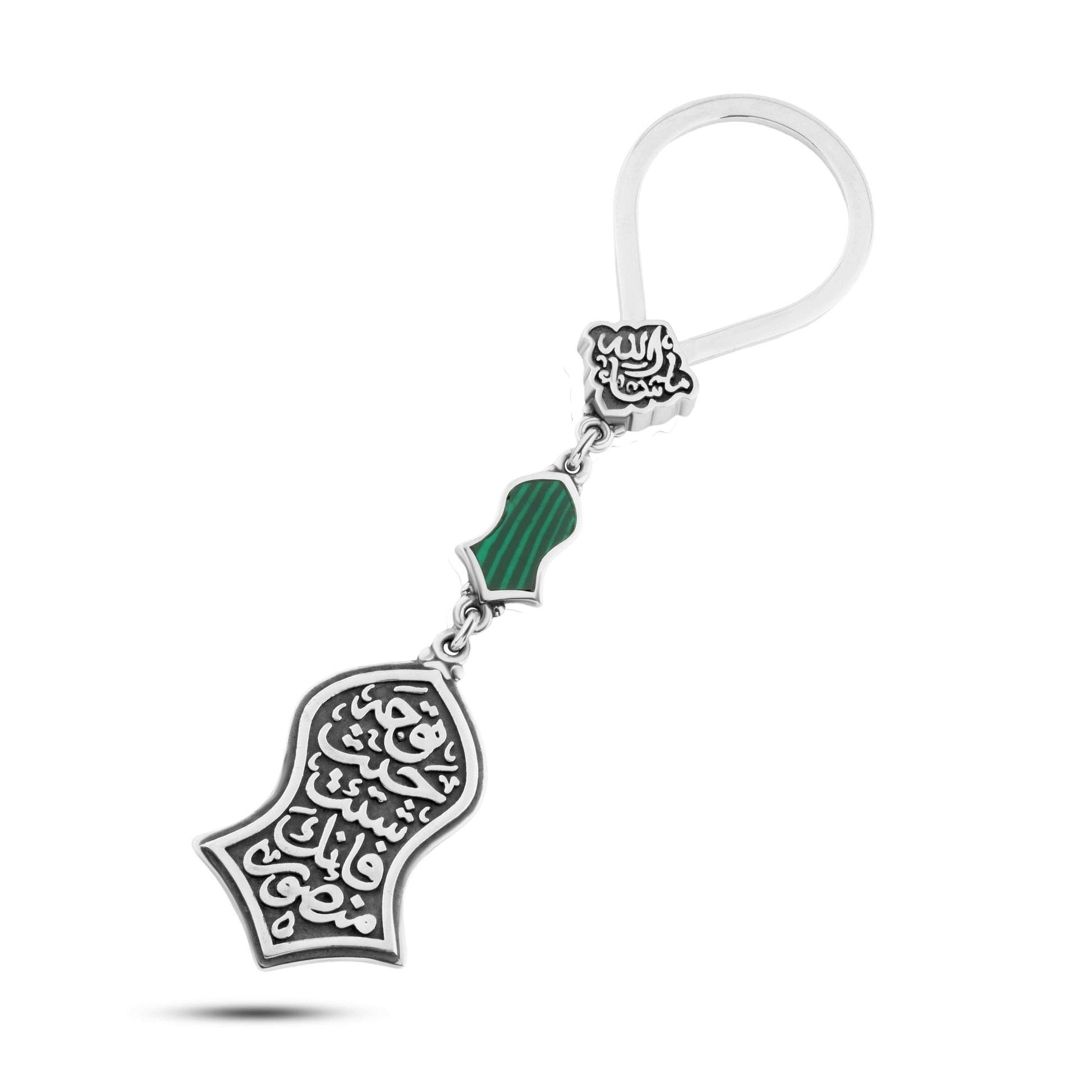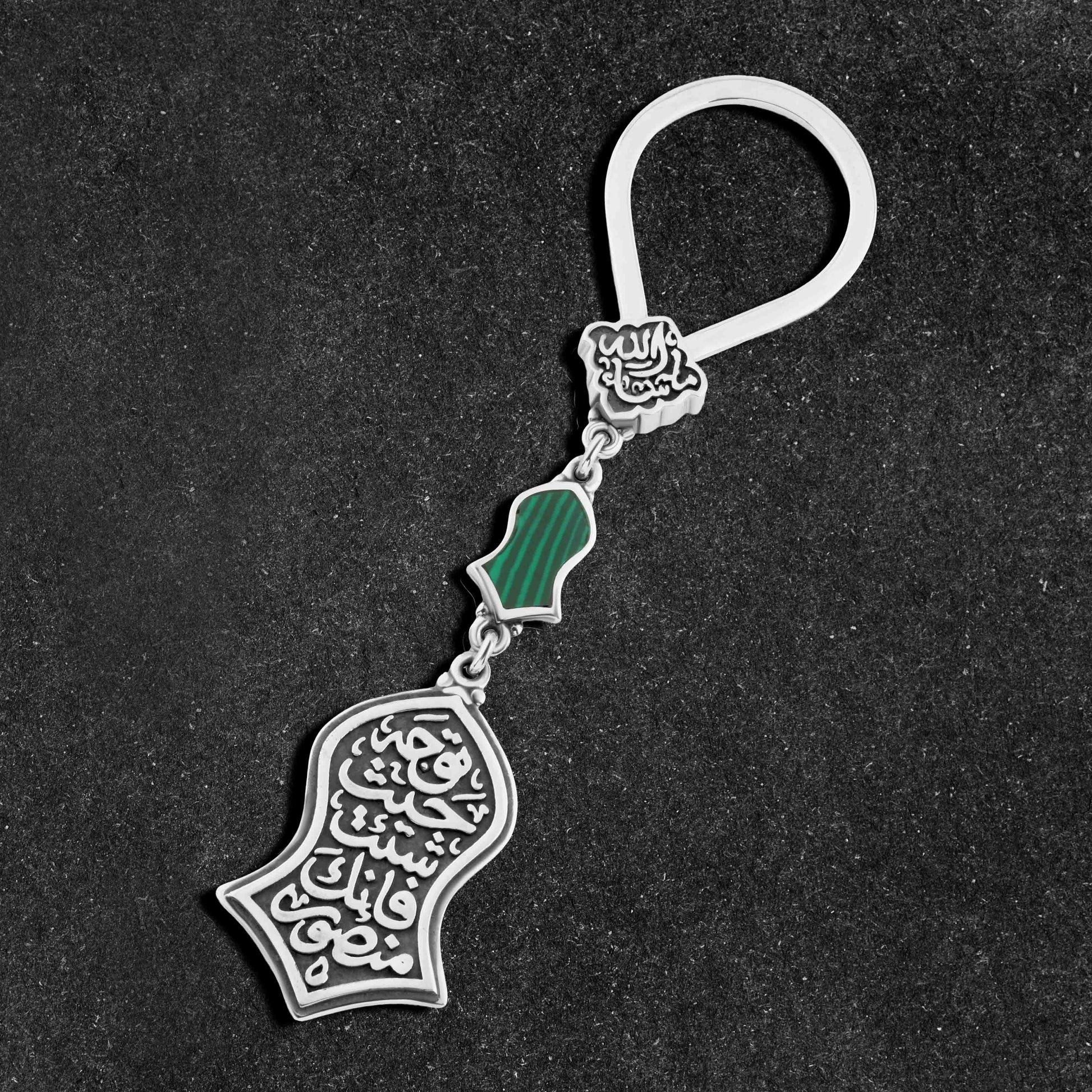 العبارة المنقوشة "توجّه حيث شئت فإنك منصور" بخط عربي أنيق تضيف بُعدًا معنويًا عميقًا، لتصبح الميدالية أكثر من مجرد إكسسوار، بل رمز للتحفيز والثقة بالنفس يرافقك يوميًا. التناسق بين لمعان فضة عيار 800 واللون الأخضر الغني لحجر الملاكيت يمنحها حضورًا راقيًا يناسب الرجال والنساء.
