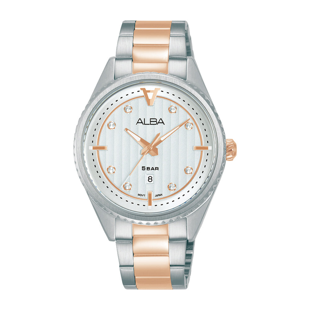 ساعة ألبا AH7AJ7X1 الحريمي بتصميم أنالوج أنيق يجمع بين الفضي والروز جولد في سوار معدني فاخر، مع ميناء أبيض ناعم مزين بمؤشرات كريستالية تضيء المظهر العام وتعزز من فخامته.