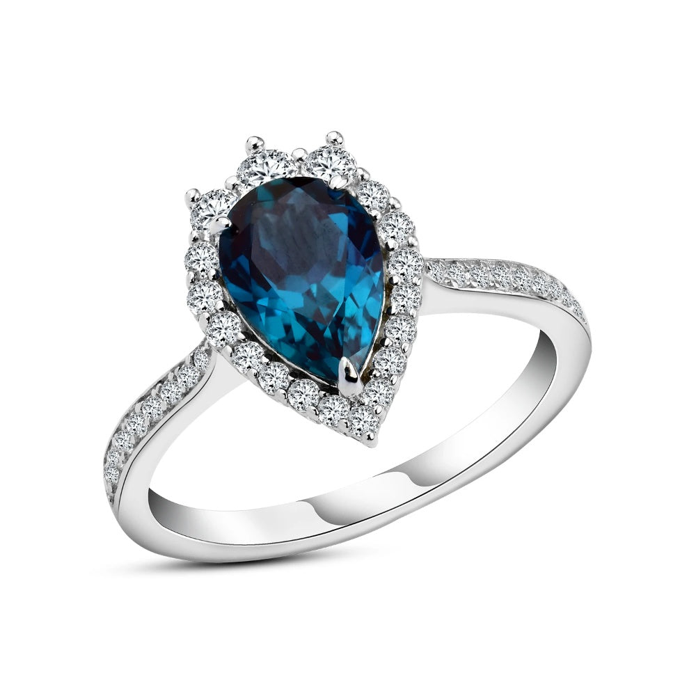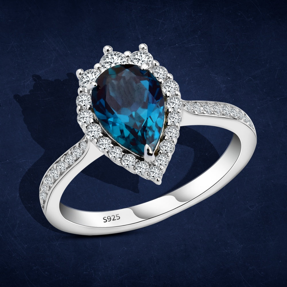 خاتم فاخر مصنوع من الفضة عيار 925، يتميز بحجر ألكسندر نايت بتصميم قطرة ماء باللون الأزرق الداكن الجذاب، محاط بهالة أنيقة من فصوص الزركون اللامعة التي تضيف تألقًا فريدًا ولمسة راقية للتصميم. السوار مزين بفصوص دقيقة تمنح الخاتم مظهرًا متوازنًا ومثاليًا للمناسبات المميزة أو الإطلالات الراقية اليومية.