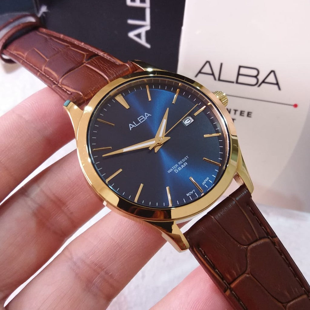 AS9M38X1 – ساعة ألبا كلاسيكية رجالي بسوار جلد بني وميناء أزرق بإطار ذهبي
