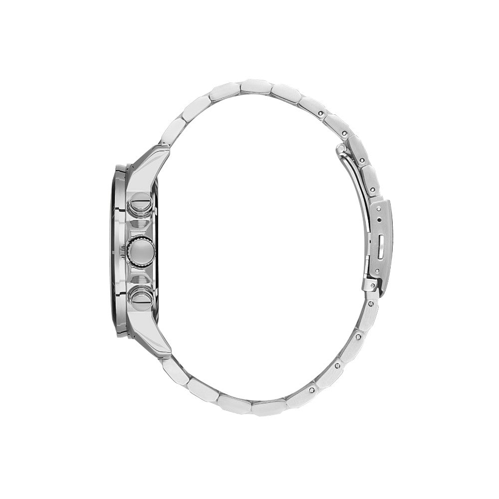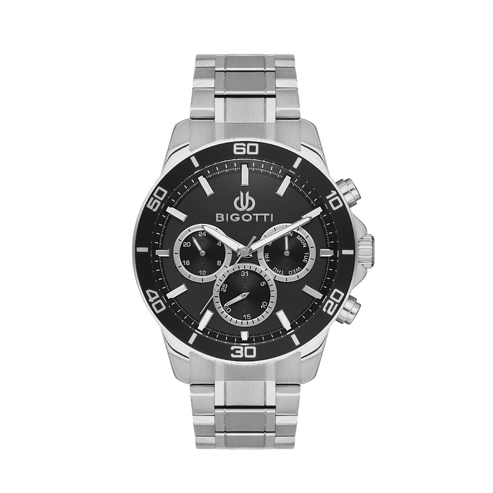 ساعة رياضية أنيقة للرجال من بيغوتي، بتصميم عصري جريء يجمع بين العملية والأناقة. تأتي الساعة بهيكل معدني لامع وسوار فضي من الستانلس ستيل، مع إطار أسود عليه مؤشرات دقيقة تضيف لمسة رياضية واضحة.