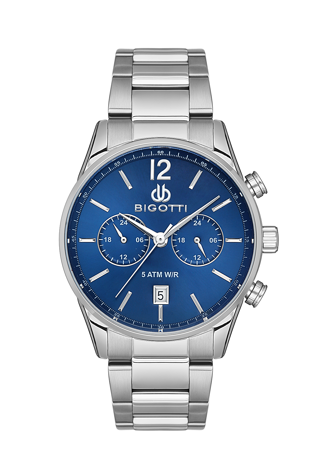 ساعة يد رجالية بيغوتي – ستانلس ستيل فضي بميناء أزرق وعدادات فرعية ونافذة تاريخ