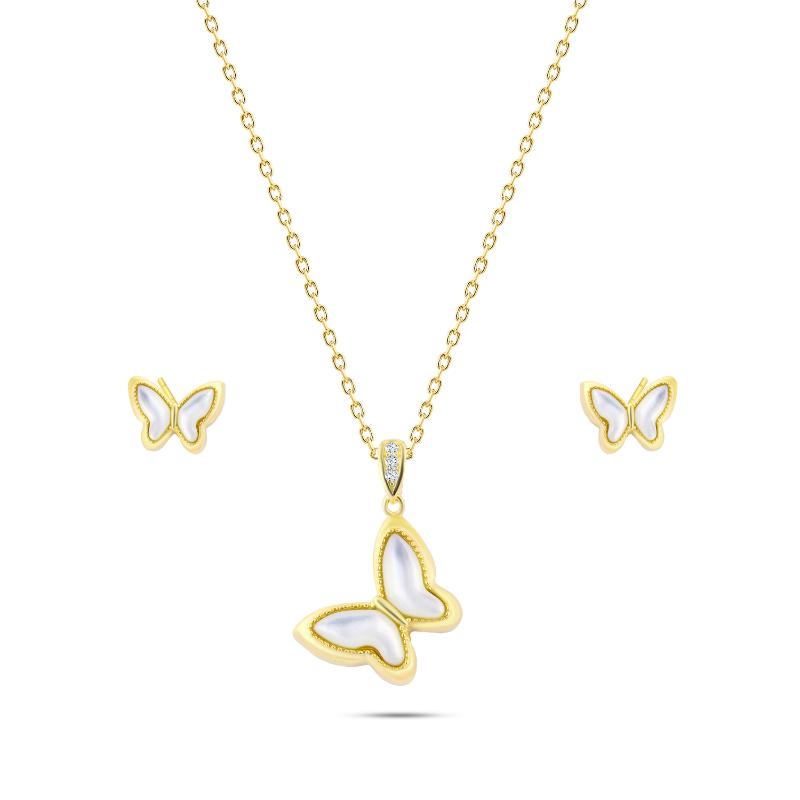 طقم فضة عيار 925 مطلي بلاتين يجسد الجمال والأناقة بشكل رائع. يتضمن الطقم قلادة رائعة مصنوعة بشكل فراشة خشبية تتألق بلمسة نهائية بيضاء ناعمة، مما يمنحها مظهرًا فريدًا وجذابًا. تعزز الأحجار اللامعة الموجودة في القلادة من إشراقتها وتعكس الضوء بشكل رائع