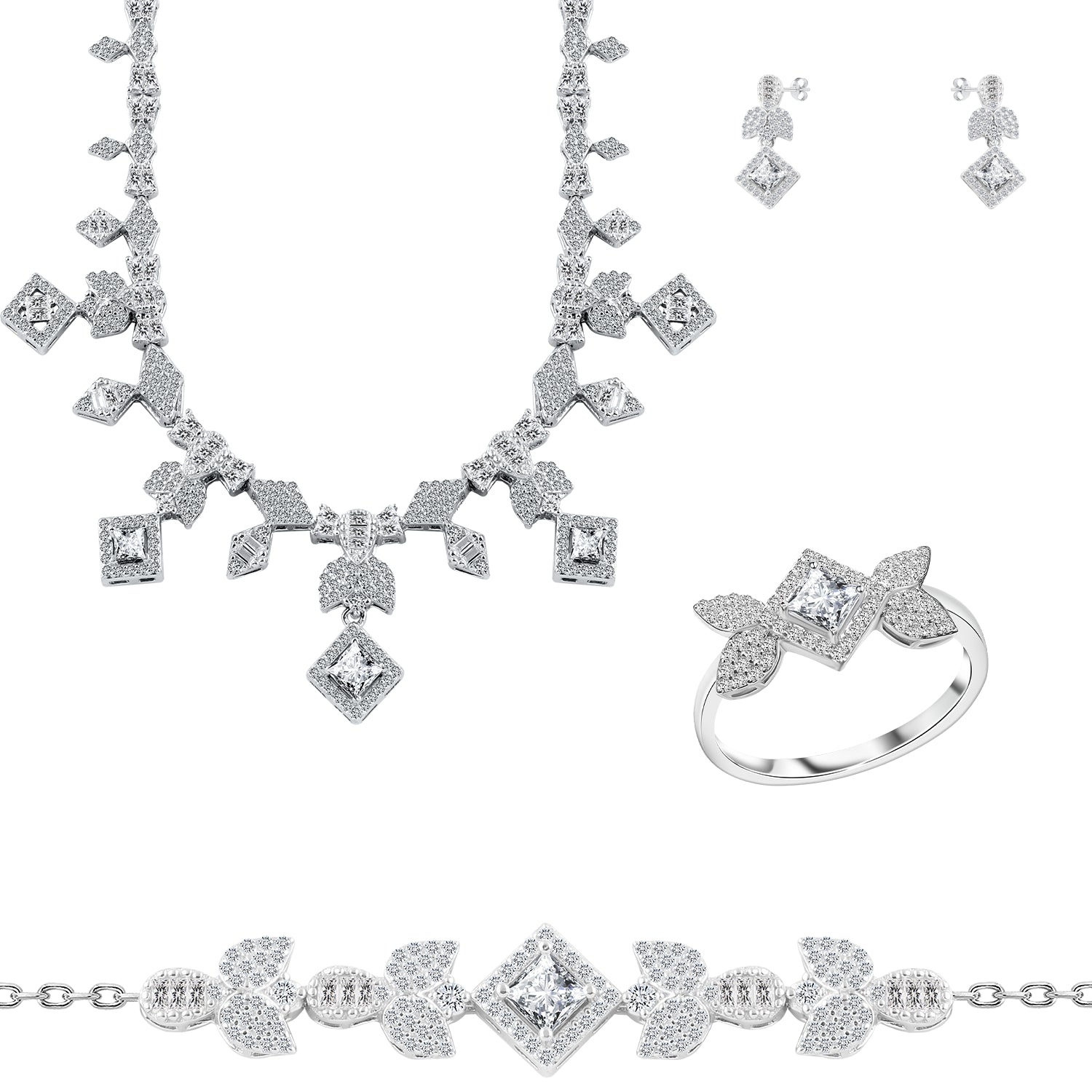 طقم أجنحة الفراشات فضة عيار 925 بفصوص الزركون البراقة، بتصميم ساحر مستوحى من أجنحة الفراشات الرقيقة. يجمع بين الأناقة والرقي ليكون إضافة مميزة في مناسباتك الخاصة وإطلالاتك اليومية. يتكون الطقم من عقد، خاتم، أقراط، وسوار لإطلالة متكاملة وجذابة.