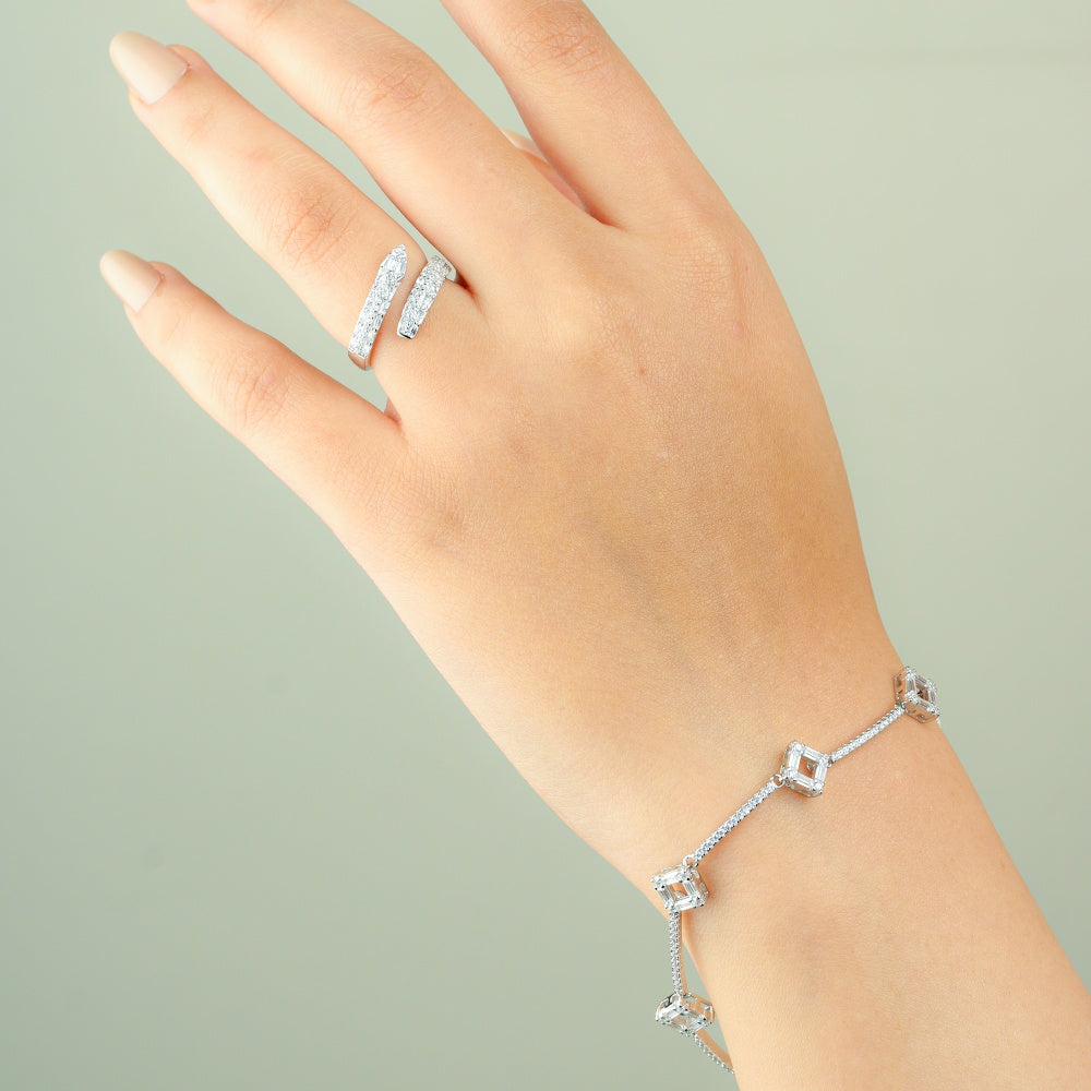 أضيفي لمسة من التميز إلى إطلالتك مع اسورة مربعات هندسية فاخرة من الفضة الإيطالية والزركون اللامع – فقط لدى فتحي إبراهيم.