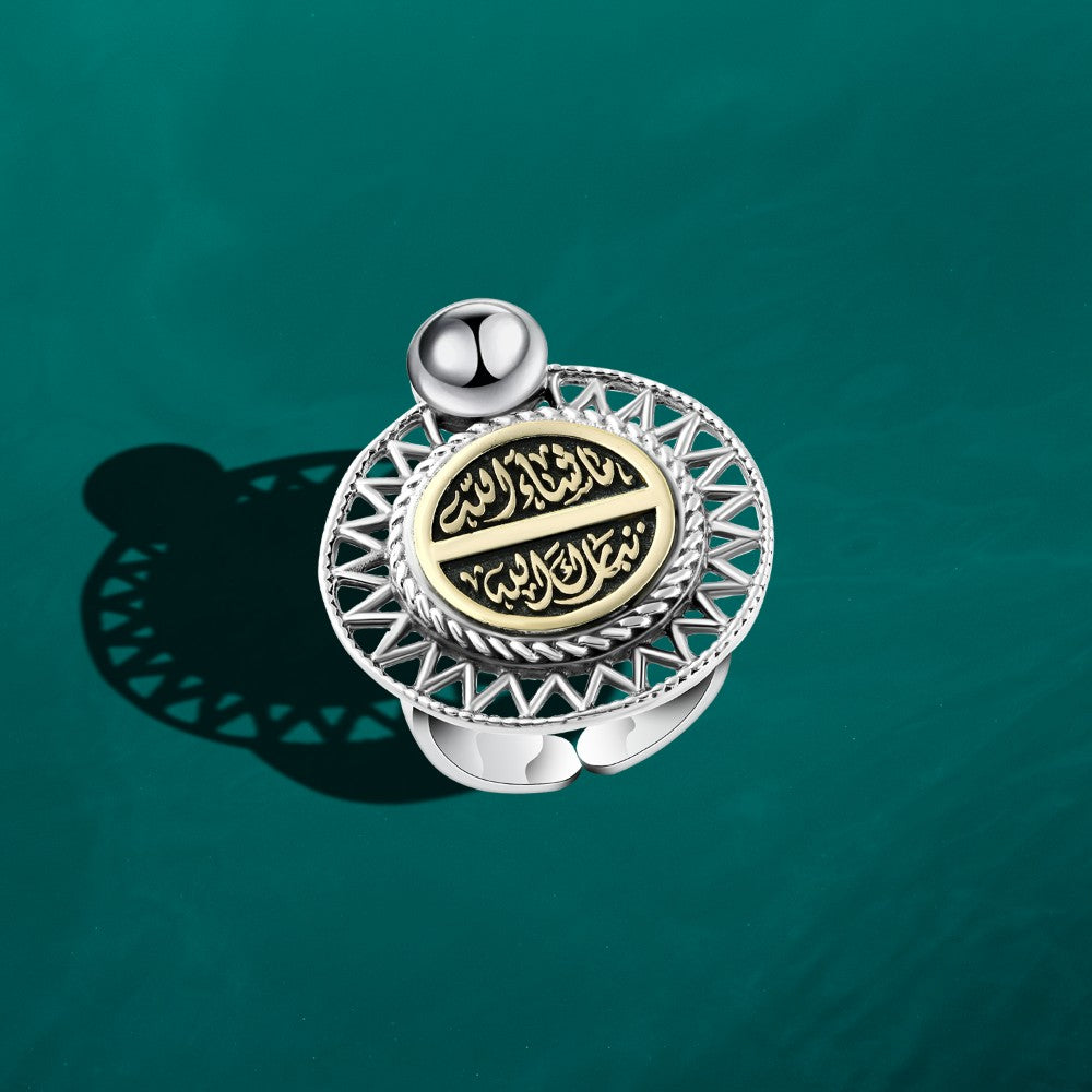 خاتم فضة مصري حريمي عيار 925، مصنوع من الفضة المصرية عالية الجودة بعيار 925، ومزخرف بنقوش رائعة تحمل عبارة “ماشاء الله – تبارك الله”. يتميز بتصميم أنيق يناسب الذوق الرفيع، حيث تجمع العبارة بين الجمال الروحي والفخامة. يعتبر هذا الخاتم خيارًا مثاليًا للنساء اللواتي يرغبن في ارتداء إكسسوارات تحمل معاني عميقة وفخمة، ويتميز بلمعان الفضة المتألق والمتانة العالية التي تضمن له الاستدامة