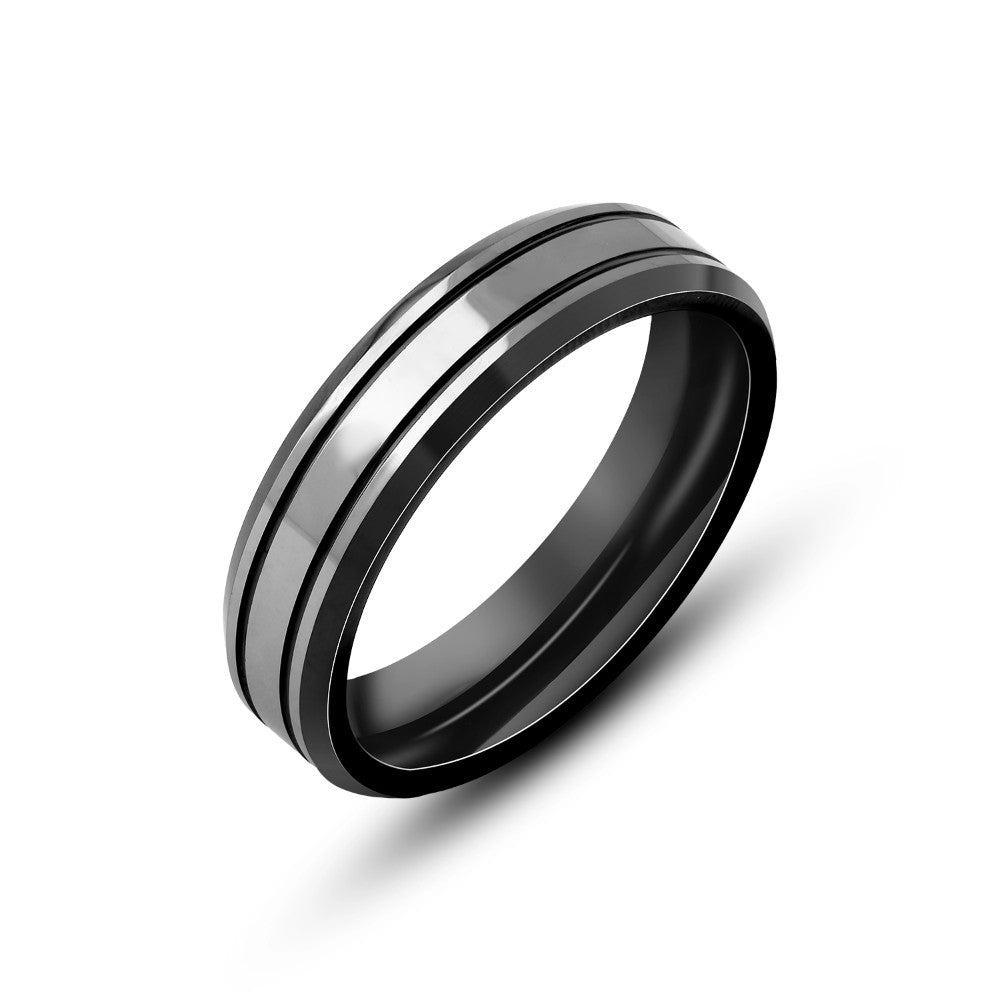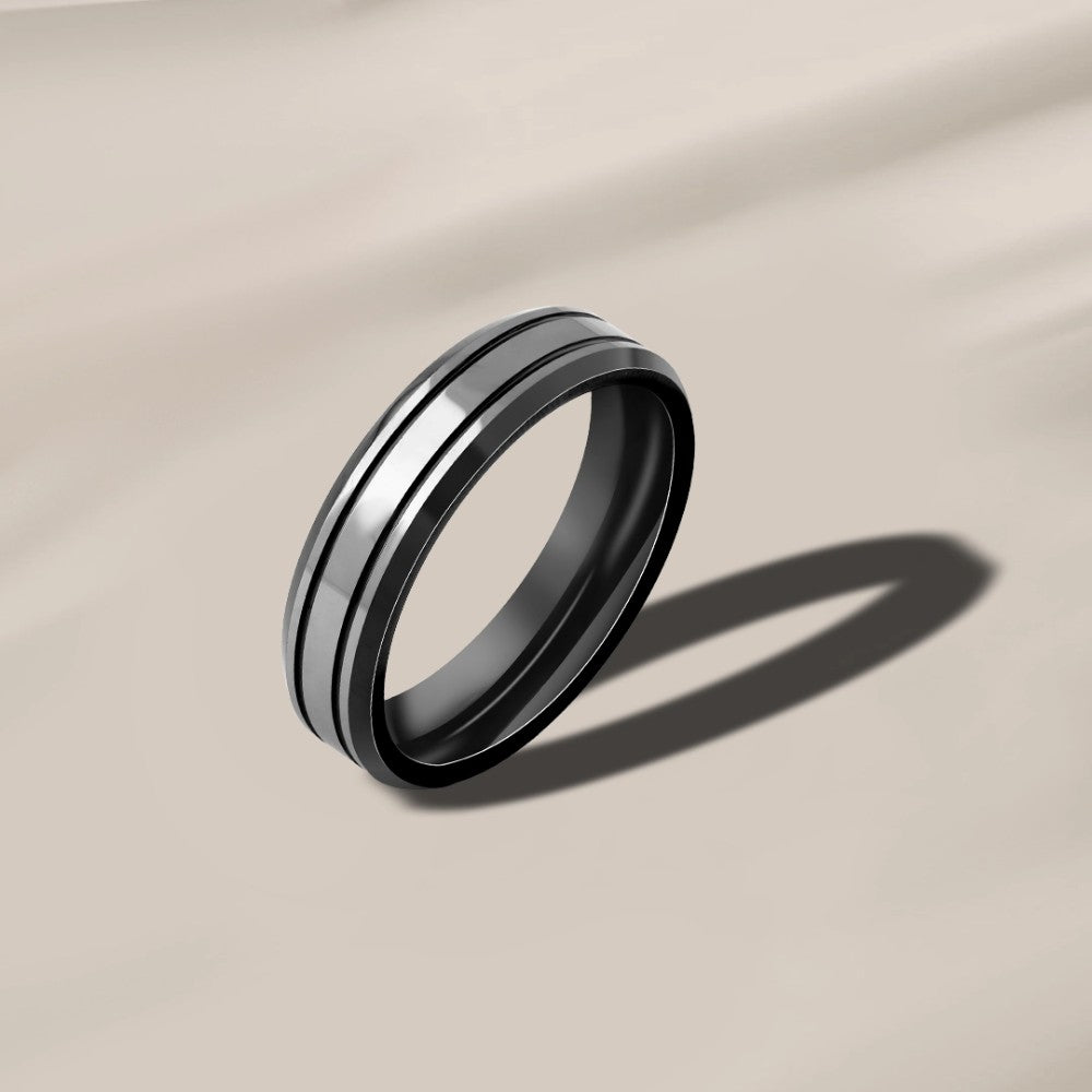 دبلة تنجستين رجالي بلون فضي متداخله بها خطوط سودا