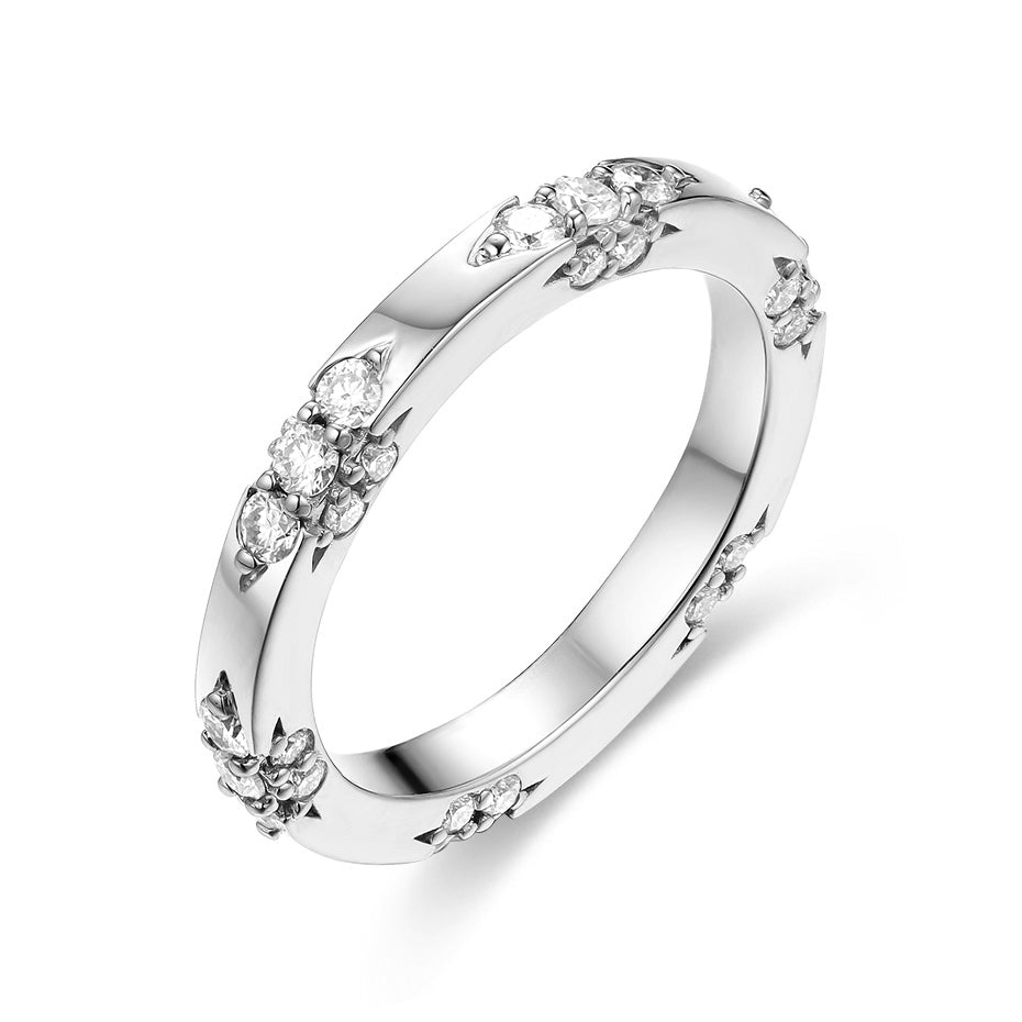 خاتم أنيق مصنوع من الفضة عيار 925 بتصميم دائري كلاسيكي مرصّع بالكامل بفصوص زركون براقة بتقطيع دائري وكمثري، موزعة على شكل زهرات صغيرة متناثرة حول المحيط. يعكس التصميم توازنًا مثاليًا بين البساطة والتألق، مما يجعله قطعة مثالية للإطلالات اليومية والمناسبات الخاصة على حد سواء، ويمكن ارتداؤه بمفرده أو تنسيقه مع خواتم أخرى.