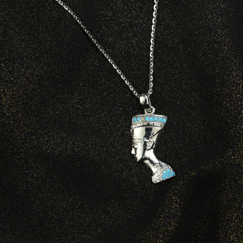 عقد أنيق مصنوع من الفضة المصرية عيار 925 بتصميم لافت يجسد وجه الملكة نفرتيتي، مرصّع بفصوص أكوا مارين ناعمة تضيف لمسة من النقاء والفخامة. يُعدّ التصميم تحية راقية لجمال الحضارة المصرية القديمة، حيث يدمج بين الرمز التاريخي والدقة المعاصرة في التصنيع. يناسب هذا العقد كل من تبحث عن قطعة تعبّر عن القوة والأنوثة في آنٍ واحد، كما يمكن ارتداؤه في المناسبات الخاصة أو الإطلالات اليومية.