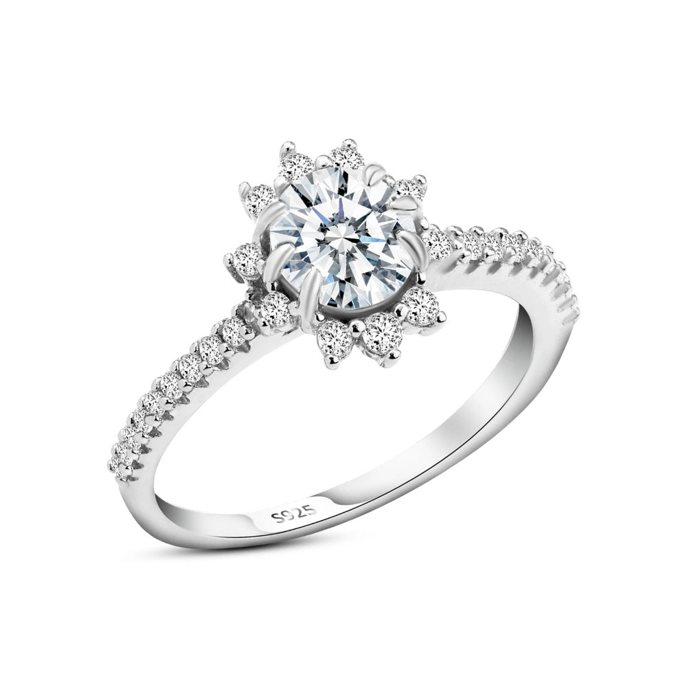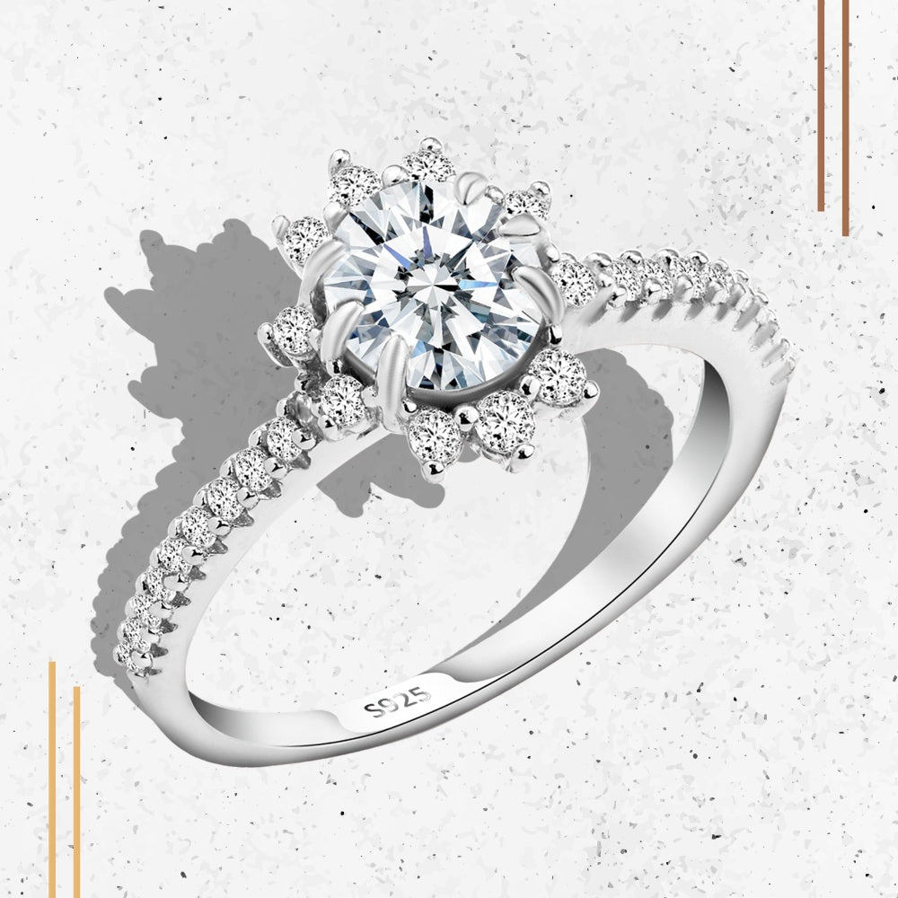 خاتم أنيق مصنوع من الفضة عيار 925، يبرز بتصميم فاخر يتوسطه حجر موزنايت دائري متلألئ يعكس الضوء ببريق مبهر، محاط بتفاصيل دقيقة من فصوص الزركون الصغيرة التي تضيف لمسة من الرقي والفخامة. تصميم الخاتم المستوحى من شكل الزهرة يجعل الموزنايت في مركز الاهتمام، ويمنحه حضورًا أنثويًا مميزًا. قطعة مثالية للإطلالات اليومية والمناسبات الخاصة.