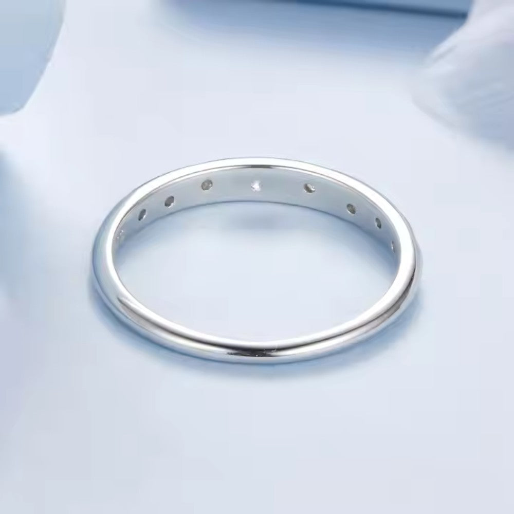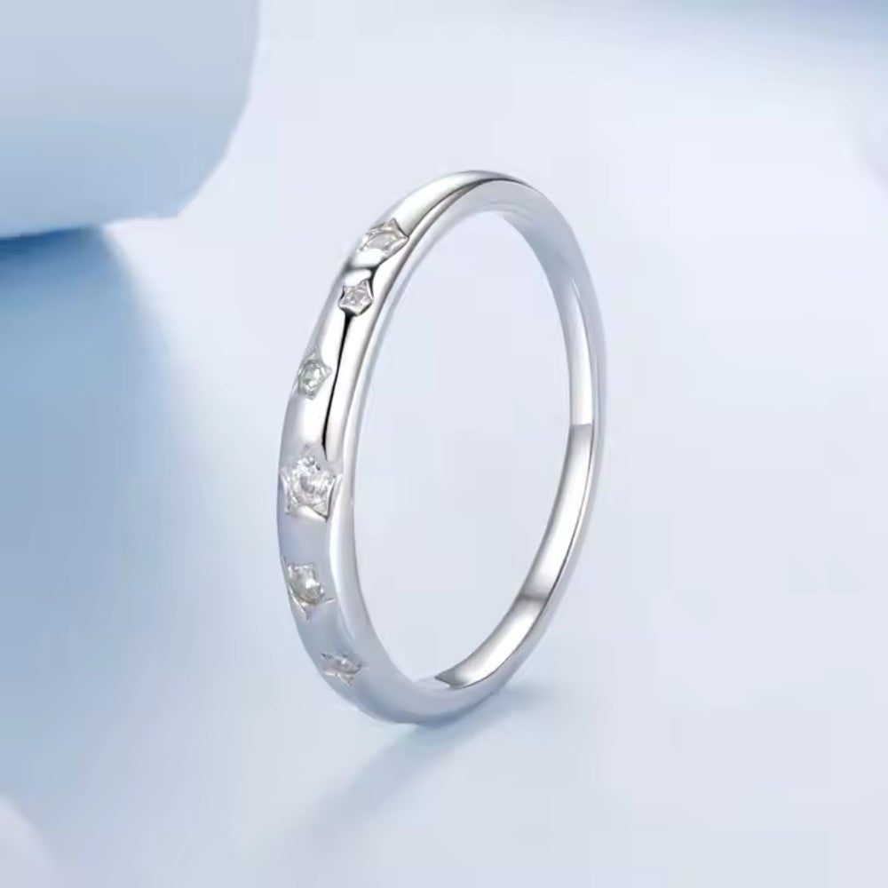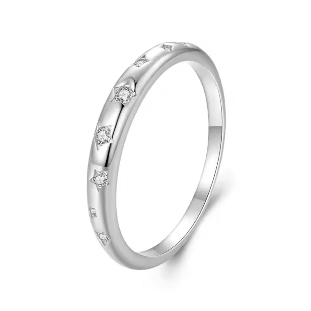 خاتم أنثوي راقٍ مصنوع من الفضة عيار 925، يتميز بتصميم بسيط وانسيابي تزيّنه نقوش نجمية صغيرة محفورة بدقة، كل منها مرصع بفص زركون أبيض لامع يمنح الخاتم بريقًا هادئًا وأنيقًا. التصميم النحيف والناعم يجعله مثاليًا للارتداء اليومي أو للتنسيق مع خواتم أخرى بأسلوب عصري.