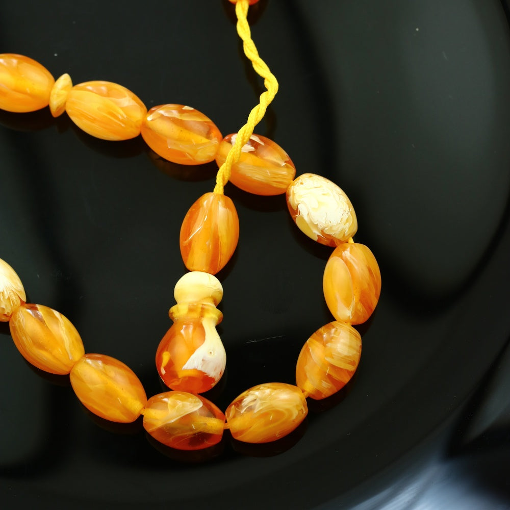 تتكون سبحه تراب كهرمان غامق من 33 حبة بيضاوية مصقولة بعناية لتوفير ملمس ناعم وسلاسة في الحركة أثناء الاستخدام، مما يجعلها مريحة في اليد ومناسبة للتسبيح اليومي.